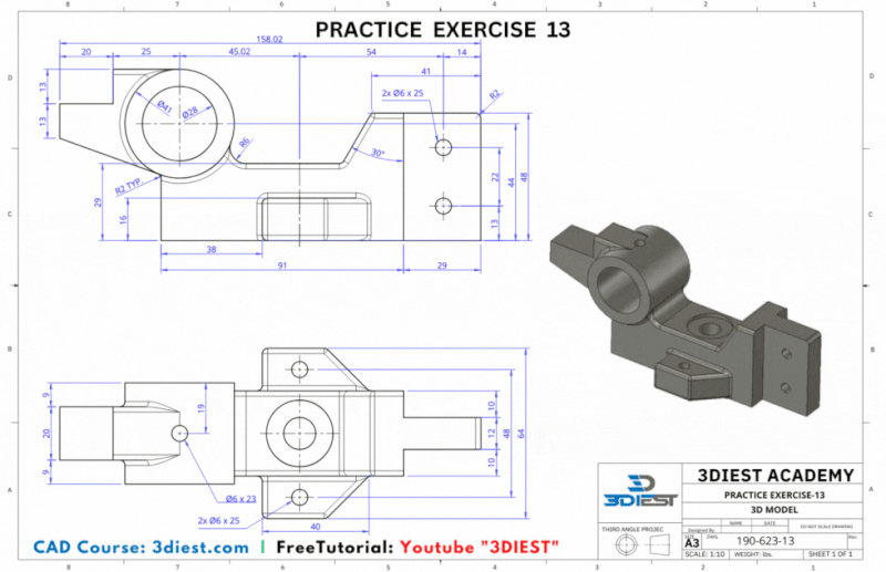 En este trabajo se debe trazar el plano de piezas y conjuntos que ya fueron creadas en el ambiente 3D (sin incluir el modelado de las mismas), la acotación de las vistas, la creación de distintos tipos de anotaciones; dentro de un formato estándar.