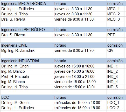 Lunes de 8:30 a 11:30 hs. en Aula 16, para estudiantes de Ing. CIVIL, Ing. en PETRÓLEO e Ing. MECATRÓNICA