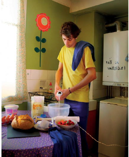 Say what they are doing, what they are wearing, mention the things in the kitchen. Use as many prepositions of place as you can. (Page 11)