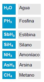 Su fórmula química contiene hidrógeno y un elemento no metálico. Recuerden que en estos compuestos el H actúa con su número de oxidación +1. La mayoría de estos hidruros se encuentran en estado gaseoso.