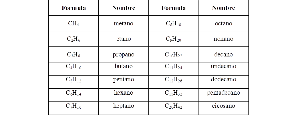 Los primeros cuatro hidrocarburos tienen nombres comunes. Los hidrocarburos saturados lineales de mayor número de átomos de carbono tienen nombres sistemáticos compuestos por un prefijo indicativo del número de átomos de carbono y la terminación ano.