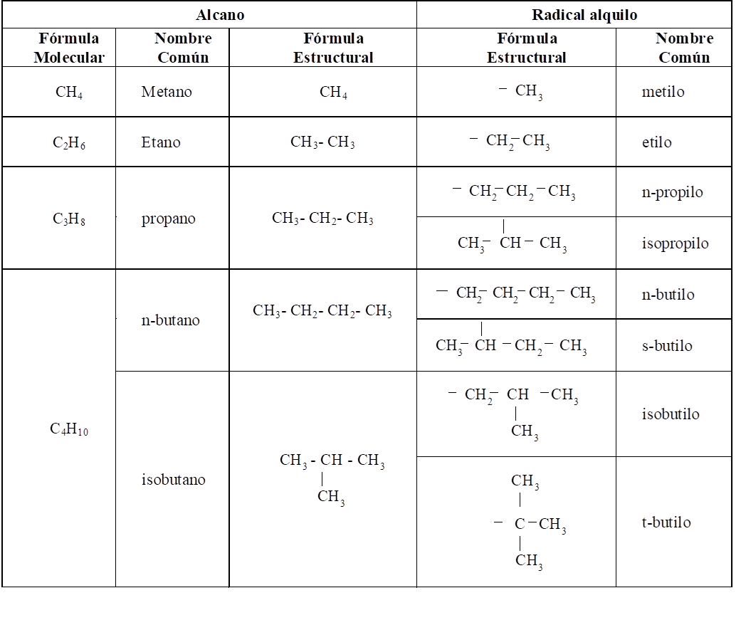 A continuación se da un resumen con los alcanos y los grupos alquilo de hasta cuatro átomos de carbono.