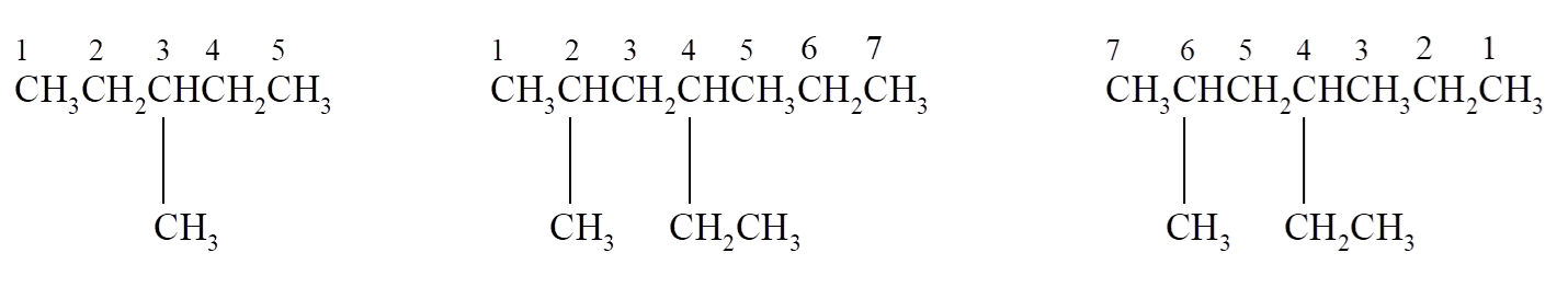 2b. Se numera la cadena principal a fin de ubicar los átomos de carbono donde se unen los sustituyentes. Siguiendo con los ejemplos anteriores, el compuesto A se ramifica en el C-3, pero para el compuesto B existen dos posibilidades. Comenzando la numeración por un extremo se ramifica en los C-2 y 4, pero comenzando por el otro, se ramifica en los C-4 y 6.