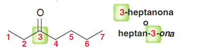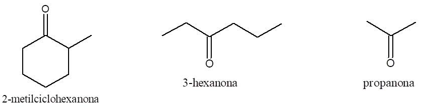Para nombrarlos se procede igual que con los aldehídos pero cambiando la terminación o del alcano de igual número de átomos de carbono por ona. Se numera la cadena asignando al carbono carbonílico el menor número posible.