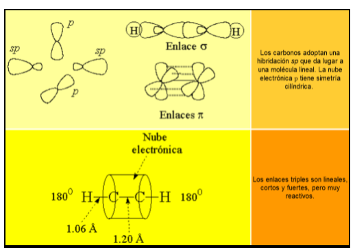 El triple enlace de los alquinos está constituído por el solapamiento frontal de dos híbridos sp (un enlace "sigma") y el solapamiento lateral de cuatro orbitales p sin hibridar (dos enlaces "pi"):