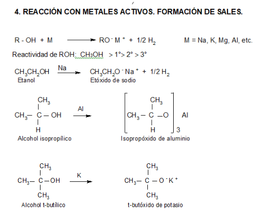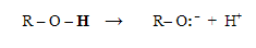 Como ácidos, los alcoholes presentan acidez similar al agua. El hidrógeno está unido al oxígeno (muy electronegativo), y la polaridad del enlace O-H facilita la separación de un protón, mientras que el oxígeno acomoda muy bien la carga negativa de los electrones dejados.