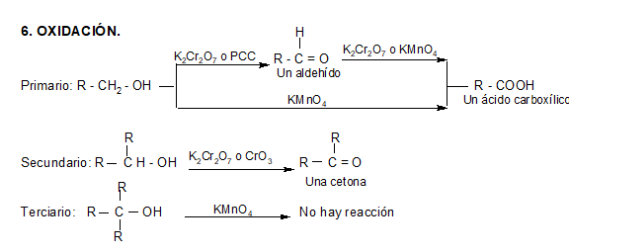 El compuesto que resulte de la oxidación de un alcohol depende del número de hidrógenos unidos al carbono enlazado con el grupo –OH, es decir, depende si se trata de un alcohol primario, secundario o terciario.