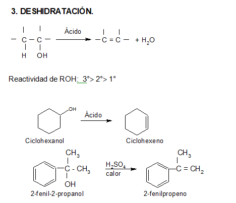 Los alcoholes, al ser calentados en medio ácido, se deshidratan intramolecularmente, formando alquenos. Para esto siguen un mecanismo de eliminación iónica.