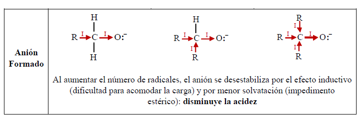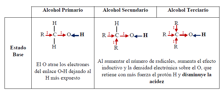 En el agua, al no haber grupo alquilo y por consiguiente efecto inductivo, el enlace O-H es más polar que en el alcohol. Además, el anión del agua es más estable que el del alcohol, en el cual el efecto inductivo aumenta la densidad negativa sobre el oxígeno, haciéndolo menos estable. Por otro lado, la solvatación del anión contribuye a la estabilización del mismo. A mayor tamaño del grupo alquilo, la solvatación se dificulta por el impedimento estérico, lo cual reduce la estabilidad del anión.