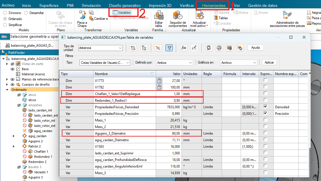Buenas tardes. Las operaciones específicas no se acotan, las variables quedan en la tabla de variables. Operaciones tales como agujeros, ranuras, chaflanes, redondeos, patrones, etc.