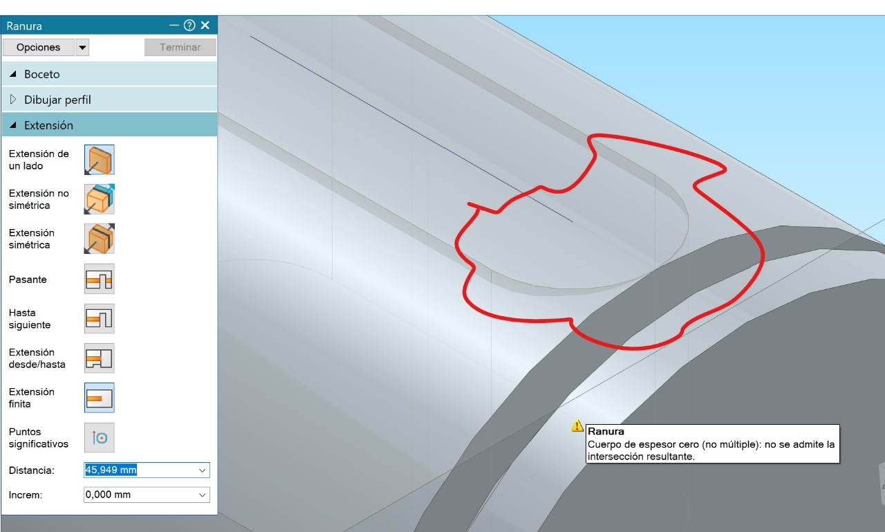 Buenas tardes. Tengo un problema para realizar el chavetero de la Pieza 2 del Trabajo Práctico. He intentado hacerlo por extrusión y con la herramienta "ranura", y obtengo el mismo mensaje de error. ¿A qué puede deberse?