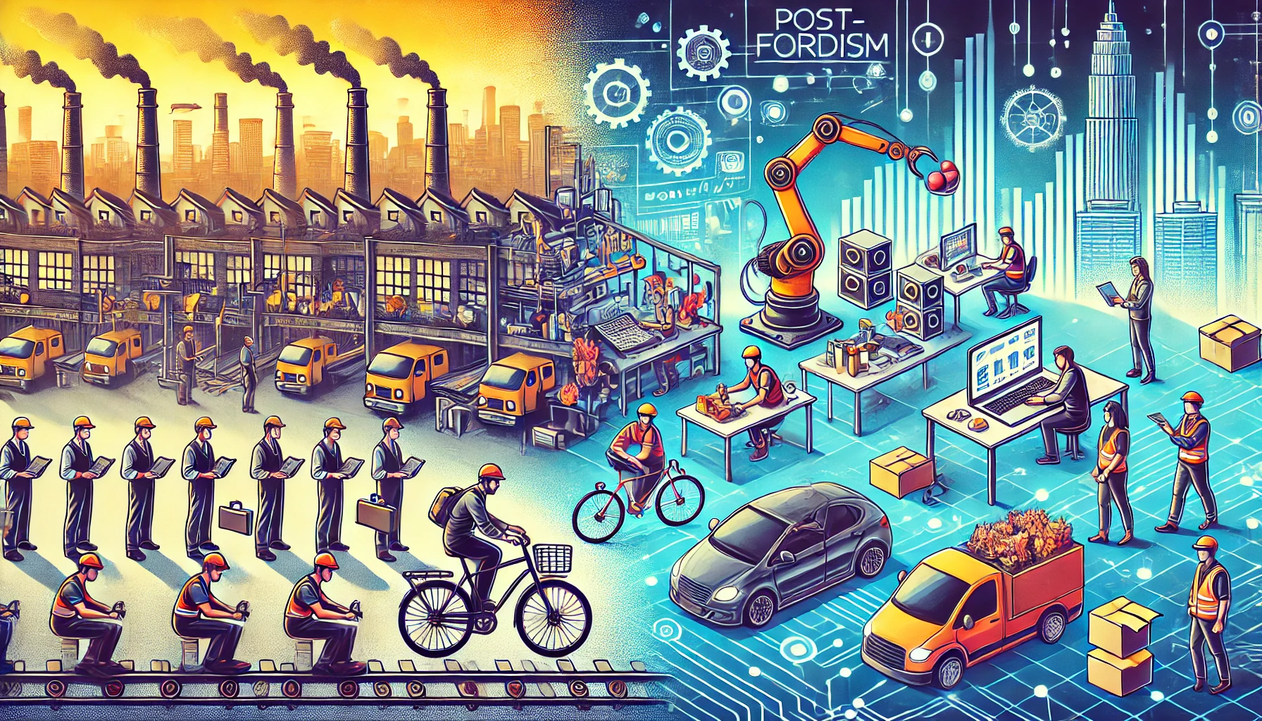 El posfordismo influye en nuestra vida cotidiana a través de la flexibilización del trabajo, la individualización laboral y la segmentación de la fuerza laboral. La producción ya no se basa en la economía de escala, sino en la economía de alcance, permitiendo una mayor diversificación de bienes y servicios. Sin embargo, esto ha llevado a una creciente precarización del empleo, con una división entre trabajadores altamente cualificados y una masa de empleados con contratos temporales y bajos ingresos, esto dado al protagonismo tomado por la electrónica y maquinaria.