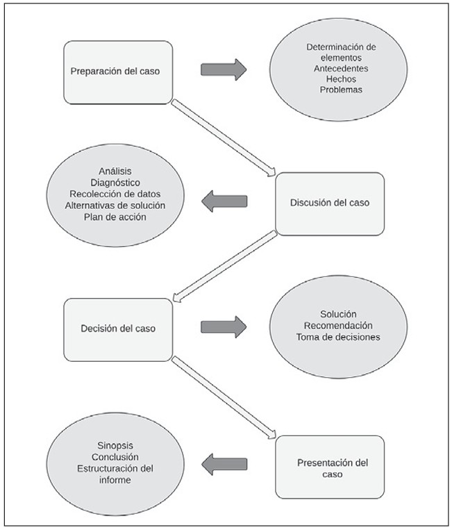 El método de casos consiste precisamente en proporcionar una serie de casos que representen situaciones problemáticas diversas de la vida real para que se estudien y analicen; asimismo, permite una interrelación fluida de los grupos. El método se estructura estableciendo una secuencia que consideramos necesaria para su desarrollo, se consideran cuatro pasos y se explican de forma sucinta en la imagen.