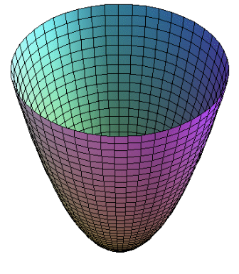 Empecemos por \(f\). Como su dominio está en \(\mathbb R^2\) y su imagen en \(\mathbb R\), su gráfico está en \(\mathbb R^3\) y podemos representarlo, usando una nueva variable para representar las imágenes: \(z=x^2+y^2\). En esta expresión reconocemos un paraboloide elíptico. Además, igualando \(k=x^2+y^2\) encontramos que, para valores positivos de \(k\), son ecuaciones de circunferencias con centro en el origen de coordenadas; si \(k=0\), se trata de un punto y, si \(k<0\) se trata del conjunto vacío (los conjuntos de nivel correspondientes a valores \(k\) que no pertenecen a la imagen de \(f\), son todos el vacío).