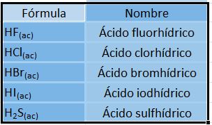 Cuando estudiamos hidruros no metálicos vimos que los siguientes hidruros gaseosos: HF, HCl, HBr, HI y H2S, cuando se disuelven en agua, se denominan hidrácidos. Su fórmula química no varía, sólo tenemos que tener en cuenta que al referirnos a estos compuestos en solución los nombramos como ácidos. El subíndice (ac) que se ve a la derecha de cada compuesto indica que están en solución acuosa: