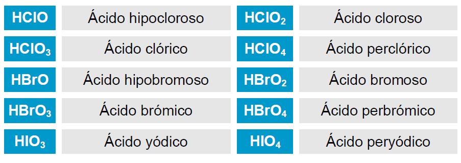 Los halógenos (F, Cl, Br, I) que forman oxoácidos son: cloro, bromo y yodo. En los tres casos los números de oxidación pueden ser +1, +3, +5 y +7. Al tener más de dos estados de oxidación, para poder diferenciar los oxoácidos que forman, se utilizan los prefijos hipo-(que quiere decir menos que) y per-(que significa superior) junto a las terminaciones -oso e -ico: Veamos cómo: