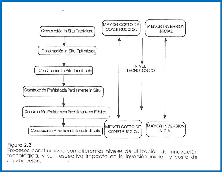 Como ya se ha mencionado durante el cursado las técnicas constructivas pueden ir desde lo completamente artesanal a lo totalmente industrializado. En la imagen siguiente pueden ver esta relación. Donde se juntan parámetros de industrialización, costo de operación, inversión y nivel tecnológico.
